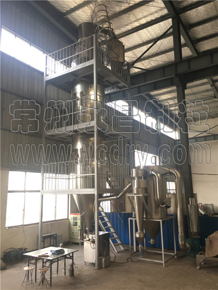 本机组工作过程为料液通过隔膜泵高压输入,喷出雾状液滴,然后同热空气并流下降,大部分粉粒由塔底排料口收集,废气及其微小粉末经旋风分离器分离,废气由抽风机排出,粉末由设在旋风分离器下端的授粉筒收集,风机出口还可装备二级除尘装置,回收率在96-98%以上。