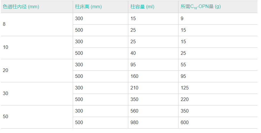 柱尺寸与所需C18-PREP填料量